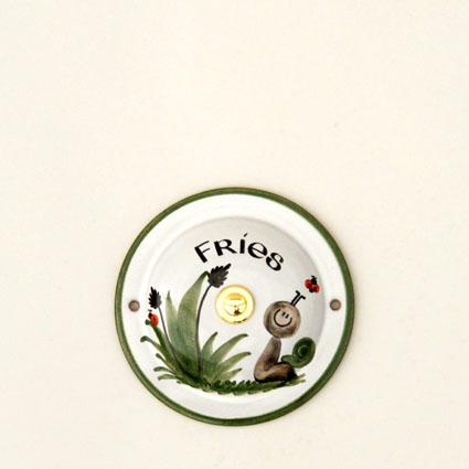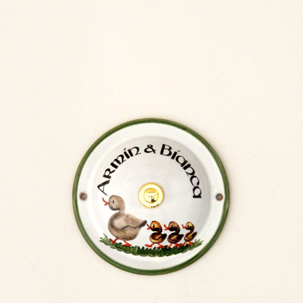 Der Rand ist normalerweise grün. Falls Sie eine andere Farbe wünschen, teilen Sie uns das bitte mit. Die Klingelknöpfe haben einen vergoldeten Taster.